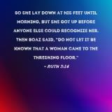 So she lay down at his feet until morning, but she got up before anyone else could recognize her. Then Boaz said, "Do not let it be known that a woman came to the threshing floor."