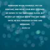 Therefore wash yourself, put on perfume, and wear your best clothes. Go down to the threshing floor, but do not let the man know you are there until he has finished eating and drinking.