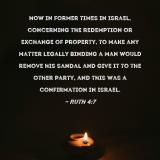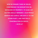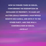 Now in former times in Israel, concerning the redemption or exchange of property, to make any matter legally binding a man would remove his sandal and give it to the other party, and this was a confirmation in Israel.