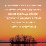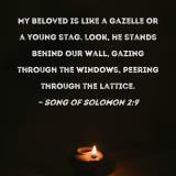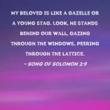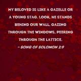 My beloved is like a gazelle or a young stag. Look, he stands behind our wall, gazing through the windows, peering through the lattice.