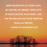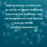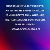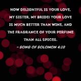 How delightful is your love, my sister, my bride! Your love is much better than wine, and the fragrance of your perfume than all spices.