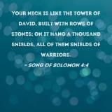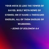 Your neck is like the tower of David, built with rows of stones; on it hang a thousand shields, all of them shields of warriors.