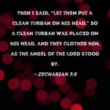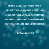 Then I said, "Let them put a clean turban on his head." So a clean turban was placed on his head, and they clothed him, as the angel of the LORD stood by.