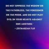 Do not oppress the widow or the fatherless, the foreigner or the poor. And do not plot evil in your hearts against one another.'